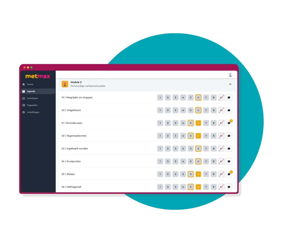 MetMax geeft je direct inzicht in voortgang, lestegoeden, geplande lessen en statussen. Dankzij slimme filters, duidelijke overzichten en gekoppelde lesvoorbereiding beheer je elke leerling sneller én foutloos.