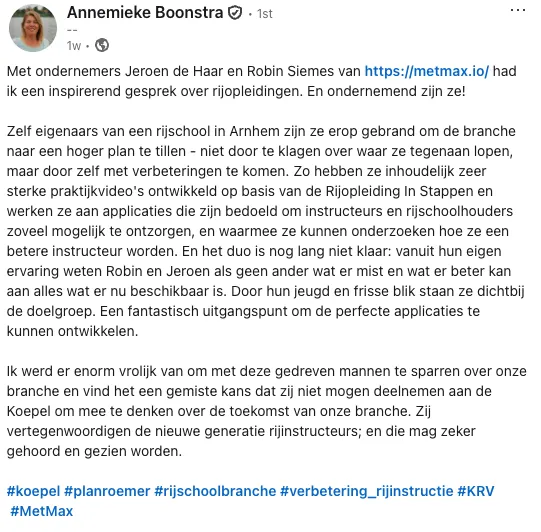 Inmiddels spreken we tientallen rijscholen die zich herkennen in de uitdagingen. Daarom is de rijschoolsoftware nu voor iedereen beschikbaar die het zichzelf graag makkelijk maakt. MetMax blijft volop in ontwikkeling met als doel: een digitale medewerker die alles regelt waar jij eigenlijk geen omkijken naar wilt hebben. Geen overhead en repetitieve bullshit taken zodat jij lol blijft houden in je werk. Wil je deel uitmaken van een partij die het echt anders doet én weet wat er in de praktijk speelt, dan ben je van harte welkom.
