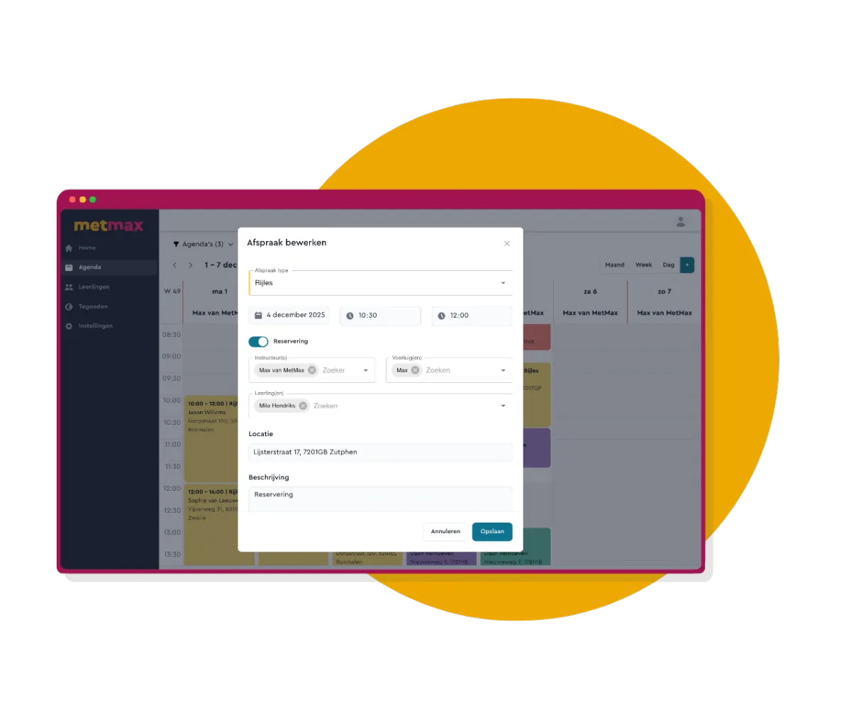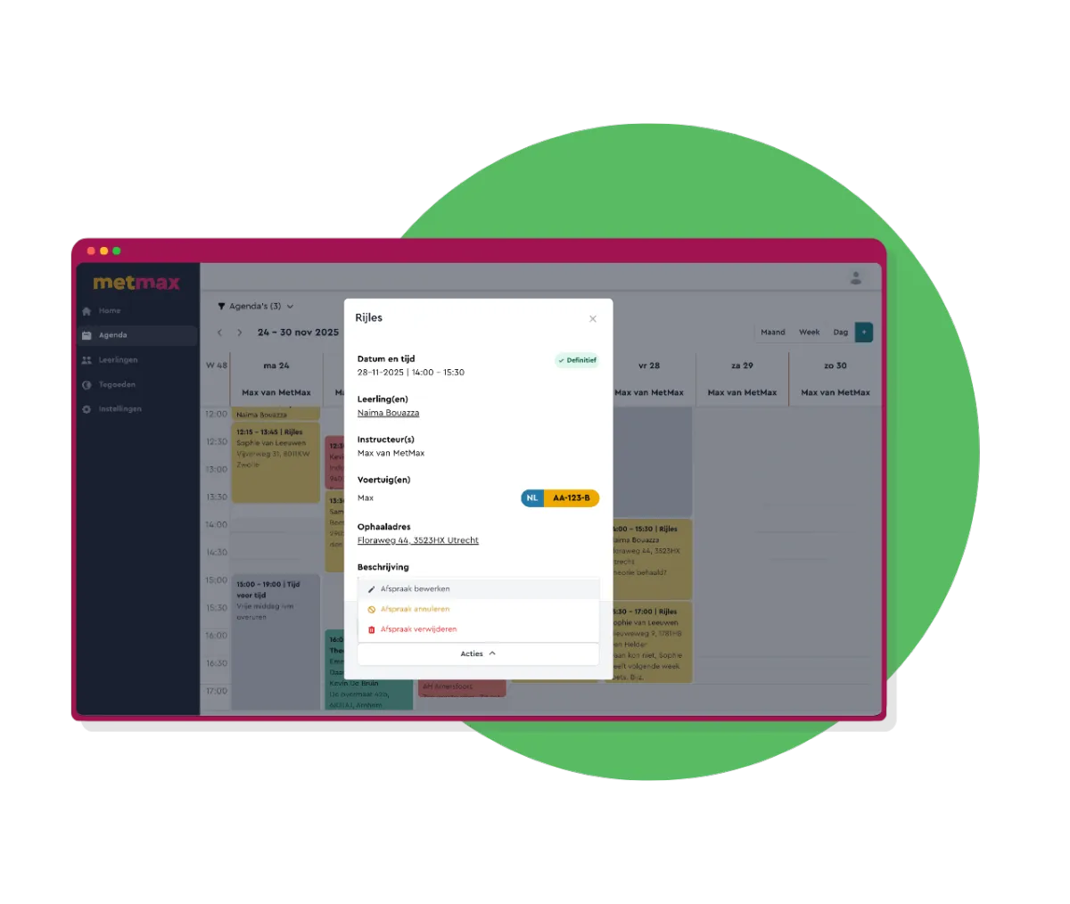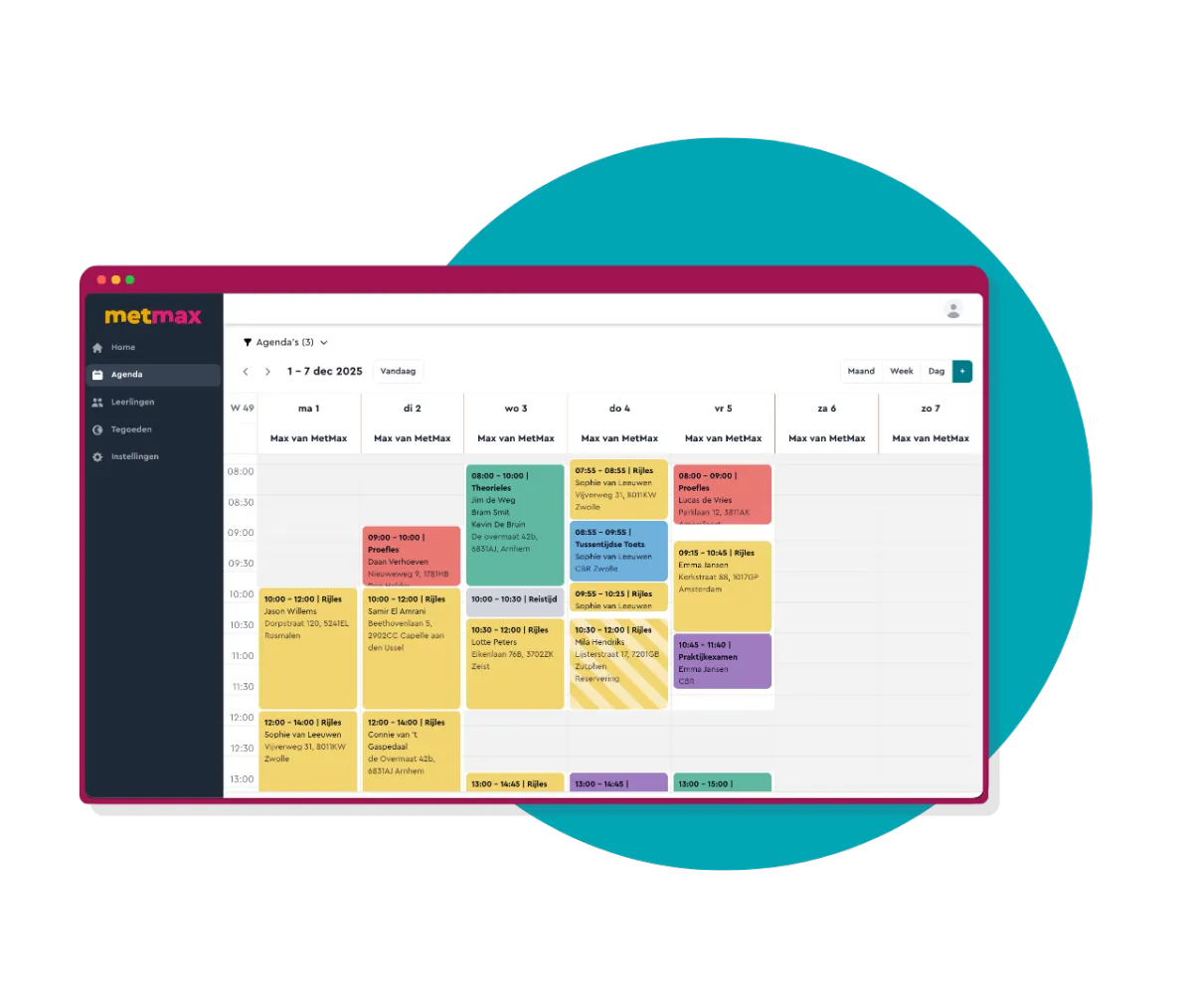 MetMax maakt plannen simpel. Plan rijlessen, cursussen, examens en proeflessen in seconden. Zie direct welke tijdsblokken vrij zijn en voorkom fouten met onze slimme controles.